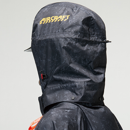ヘルメットがスッポリ入る着脱可能なフード付きで頭まで風を届けます。