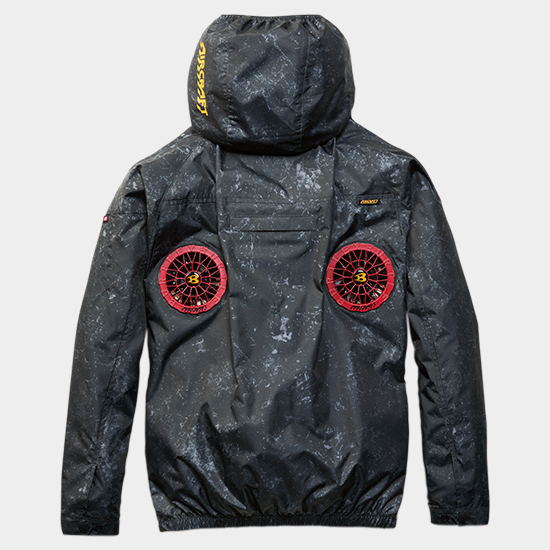 着脱可能なフード付きでフードを被れば頭まで風を届けます。UVカット付きの生地なので首裏に当たる日光をブロックします。