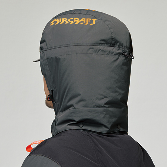 着脱可能な大型のフード付きで、フードを被れば頭まで風を届けてくれる。